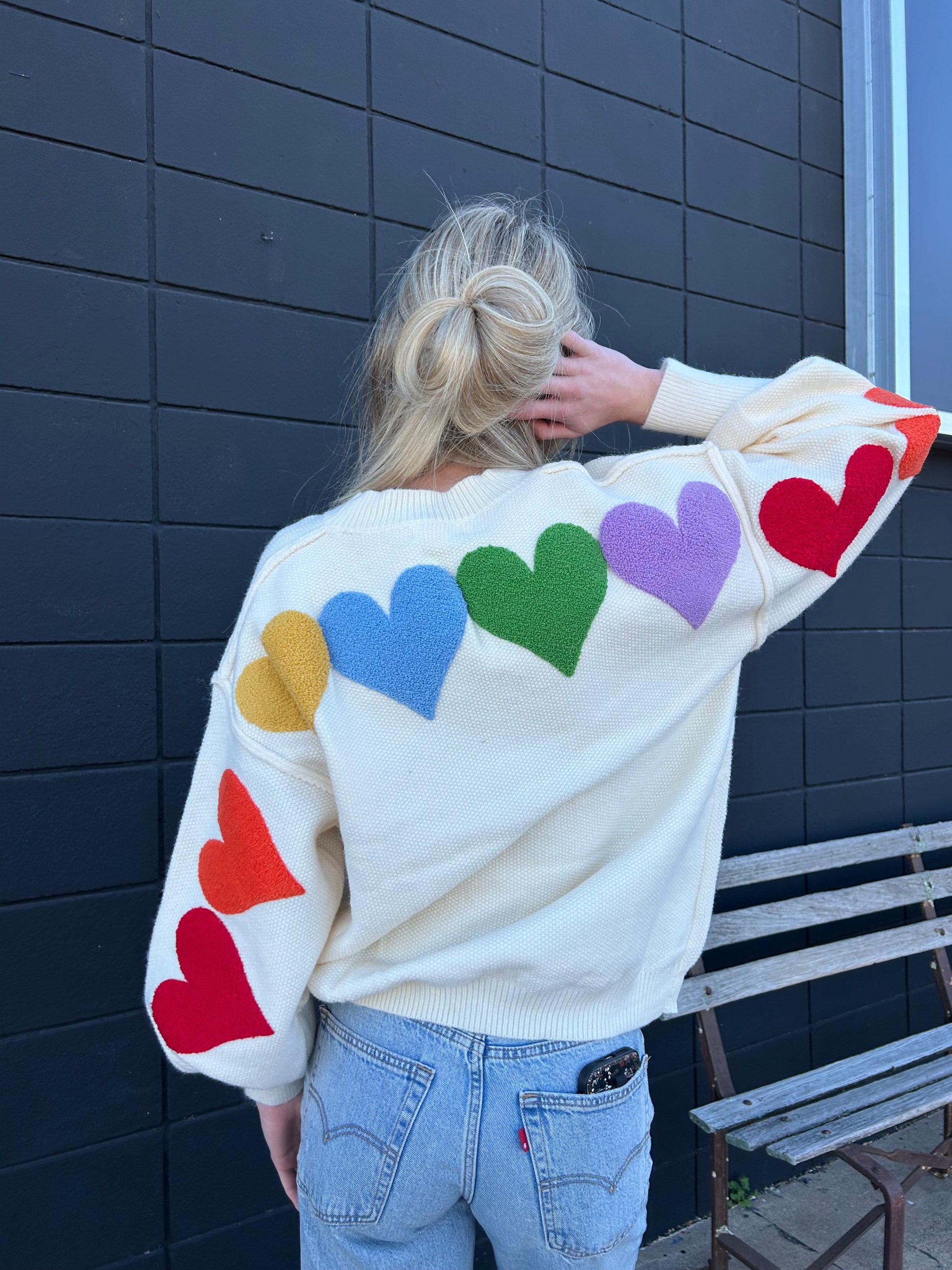The Rainbow Heart Shaped Patch Sweater is the perfect way to prepare for Valentine's Day or the spring season!