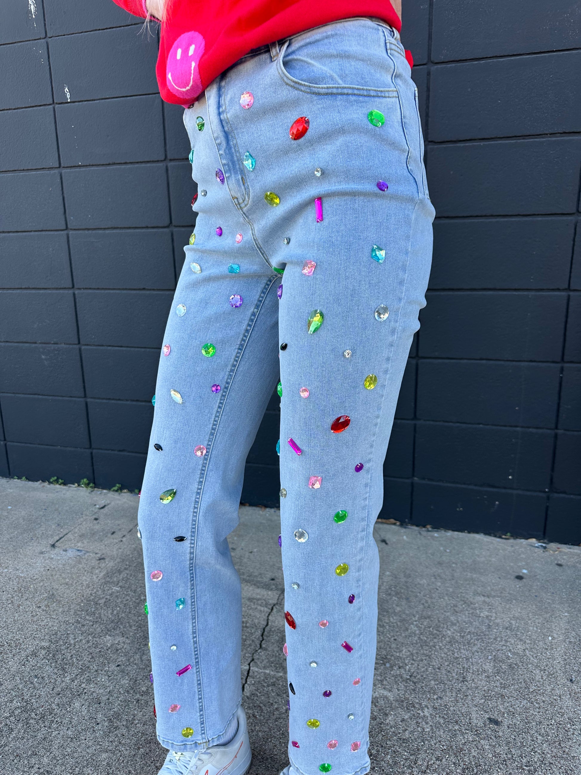 Make a statement with our Rainbow Jewel Jeans! These are sure to catch anyone's eye!